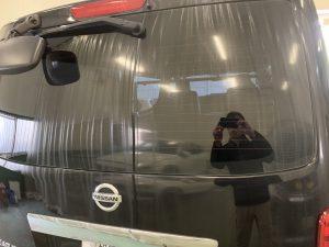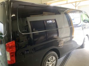 キャラバン リア5面に1番濃い3%のフィルムを施工いたしました。もともとがプライバシーガラスが入っていないタイプなので3%のフィルムでも濃すぎず、ちょうどいい感じになったのでないでしょうか